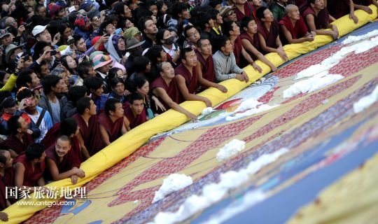 國(guó)家旅游地理 西藏拉薩8月6日訊 8月6日,拉薩哲蚌寺舉行展佛儀式。當(dāng)日,以西藏最大的格魯派寺廟哲蚌寺展佛為開端的雪頓節(jié)在拉薩拉開序幕。每年藏歷六月底七月初是西藏傳統(tǒng)的節(jié)日“雪頓節(jié)”。在藏語中,“雪”是酸奶子的意思,“頓”是“吃”“宴”的意思,“雪頓節(jié)”按藏語解釋就是吃酸奶子的節(jié)日,因此又叫“酸奶節(jié)”。因?yàn)?ldquo;雪頓節(jié)”期間有隆重?zé)崃业牟貞蜓莩龊鸵?guī)模盛大的曬佛儀式,所以有人也稱之為“藏戲節(jié)”“曬佛節(jié)”。 /新華社記者 普布扎西攝