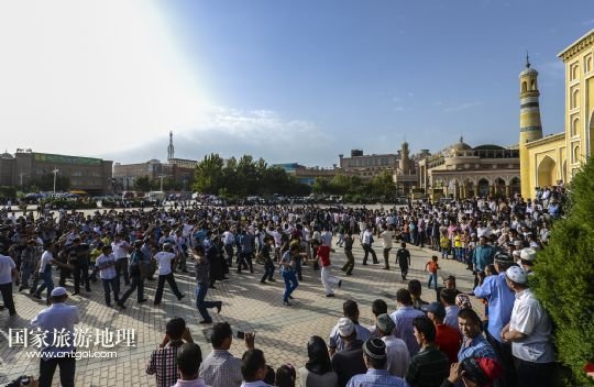 當(dāng)日,近3萬名各族穆斯林群眾前往新疆最大清真寺——艾提尕爾清真寺做禮拜,喜迎開齋節(jié)。