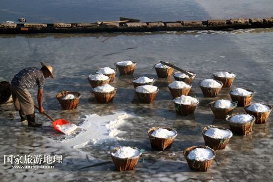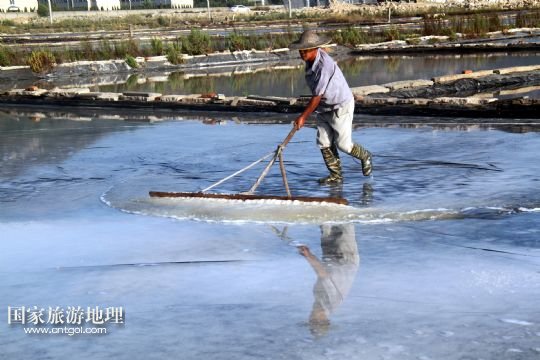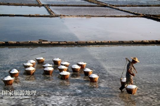 國家旅游地理 浙江臺(tái)州8月10日訊 8月10日,在浙江溫嶺市石塘鎮(zhèn)蒼岙鹽場,一名鹽工頂著太陽在鹽田里把曬好的鹽收集起來挑到鹽堆去。連日來,浙江省溫嶺市石塘鎮(zhèn)蒼岙鹽場的鹽工利用晴熱天氣忙著曬鹽。對于浙江的曬鹽人來說,夏季陽光最猛烈的7月、8月、9月這三個(gè)月是他們勞作的黃金季節(jié)。天氣越炎熱,光照越猛烈,曬鹽效果就越好。炎熱的夏天艷陽高照,而曬鹽人卻要頂著高溫出門勞作。 /新華社發(fā)(梁敏慧 攝)