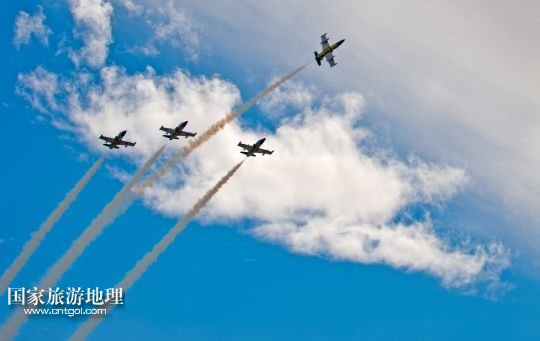 國(guó)家旅游地理 新疆克拉瑪依8月14訊 8月14日,百年靈噴氣機(jī)隊(duì)抵達(dá)新疆克拉瑪依機(jī)場(chǎng)時(shí)編隊(duì)通場(chǎng)。當(dāng)日,將參加2013克拉瑪依航空旅游節(jié)的百年靈噴氣機(jī)隊(duì)從甘肅嘉峪關(guān)起飛,經(jīng)由新疆吐魯番飛抵克拉瑪依。 /新華社發(fā) (傅定彥 攝)