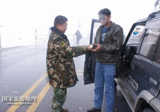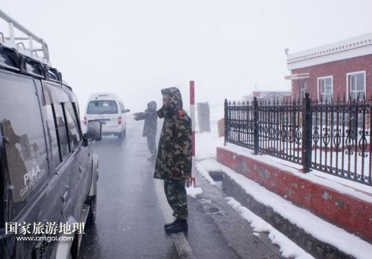 國家旅游地理 新疆喀什8月15日訊 8月14日,紅其拉甫邊檢站執(zhí)勤哨兵引導(dǎo)車輛通行。8月14日,新疆塔什庫爾干塔吉克自治縣迎來降溫降雪天氣,積雪厚度達(dá)5厘米,溫度降至零攝氏度左右。據(jù)了解,因連續(xù)降雪,314國道海拔5100米的中巴邊境紅其拉甫口岸附近約20公里路段交通受到影響。 /新華社發(fā)(韓廣寧攝)