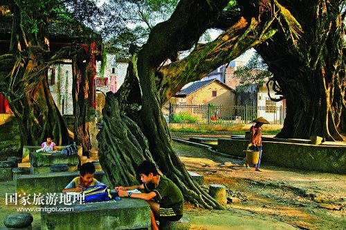 其四,鏡頭也能說故事,圖片里面有人文。呂建偉并沒有把古榕、古建筑當作無生命的標本來拍攝,而是用鏡頭來記錄那方水土中人們的生存環(huán)境、生活內(nèi)容和精神風貌,讓平面的圖片凸顯出豐富的、具有特色的人文元素來。從圖片的標題《冬陽遍灑暖人間》、《古榕塘畔好“擺古”》、《憶往昔舊事歷歷味更濃》、《看今朝雛燕展翅欲高飛》中,就能看出作者“以攝影圖片說人文”的理念。