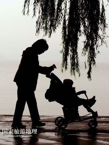 11月4日,一位市民推著童車在西湖岸邊游玩。