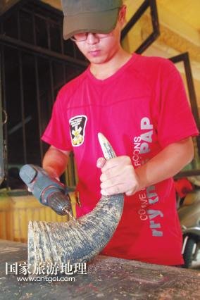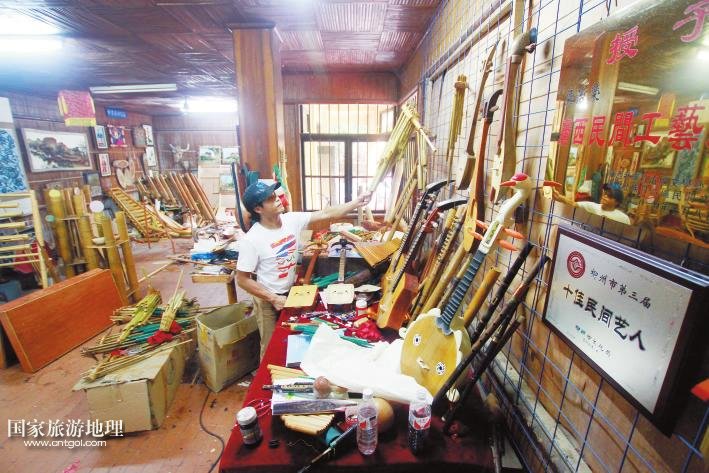 國(guó)家旅游地理 廣西柳州11月11日訊(記者陸旺楊春) 牽手漫步龍?zhí)睹琅?,并肩靠背沐浴晚秋暖?yáng),你會(huì)時(shí)常聽到一串串動(dòng)人的音符:它時(shí)而渾厚圓潤(rùn)、清脆響亮,時(shí)而輕靈縹緲、悠長(zhǎng)凄美。不忍打破這份寂靜閑情,卻又忍不住猜想:這是何方人士,用何種樂(lè)器,吹拉彈撥出如此佳音?穿越叢林,循聲走去,瑤寨庭前,幾個(gè)年輕男女手握蘆笙,身子左搖右晃,吹得正起興。步入瑤寨一樓才發(fā)現(xiàn),這里儼然一個(gè)生產(chǎn)民族樂(lè)器的大工廠:木板、竹竿、鐵鋸、膠水、油漆,以及形狀酷似牛頭、牛腿、魚身、龍身等顏色各異、五花八門的樂(lè)器……一位正在給樂(lè)器上漆的中年人梁志榮告訴記者,這是龍?zhí)豆珗@正在籌建的民族樂(lè)器館,也是魚峰區(qū)創(chuàng)建廣西文化強(qiáng)區(qū)的特色景區(qū)之一,他現(xiàn)在是大龍?zhí)睹褡逅囆g(shù)團(tuán)團(tuán)長(zhǎng),研究、制作民族樂(lè)器將近20年,曾獲“廣西民間工藝大師”和“十佳民間藝人”稱號(hào)。