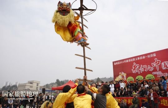 2月4日,廣西象州縣的農(nóng)民舞獅隊在表演上刀山絕技。