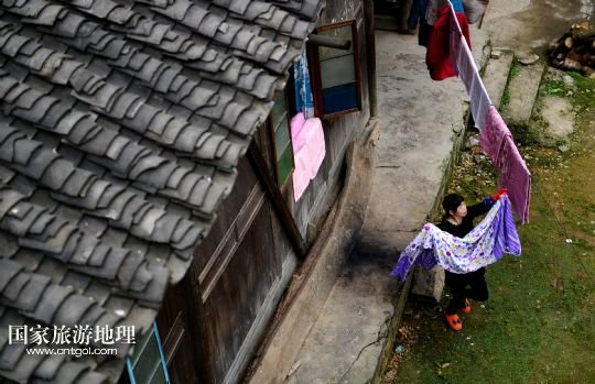 3月27日,一名土家女子在慶陽(yáng)古街的吊腳樓前晾曬衣被。