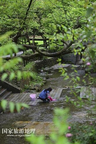 4月27日,一名女子在村里的小溪邊洗衣服。