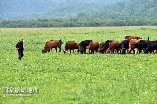 7月13日,農(nóng)戶在神農(nóng)架大九湖高山濕地放牛。