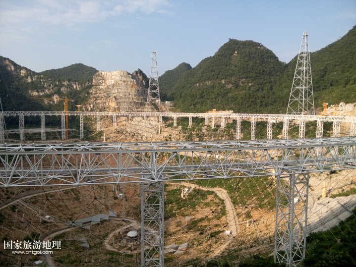 這是黔南平塘縣正在建設(shè)的大射電望遠(yuǎn)鏡,也稱 FAST,預(yù)計(jì)將于明年九月建成。FAST具有中國獨(dú)立自主知識(shí)產(chǎn)權(quán),是世界上正在建造及計(jì)劃中的口徑最大、最具威力的單天線射電望遠(yuǎn)鏡,其設(shè)計(jì)綜合體現(xiàn)了我國高技術(shù)創(chuàng)新能力。500米口徑球面射電望遠(yuǎn)鏡是利用貴州喀斯特地區(qū)的洼坑作為望遠(yuǎn)鏡臺(tái)址,建造世界第一大單口徑射電望遠(yuǎn)鏡,其擁有30個(gè)標(biāo)準(zhǔn)足球場(chǎng)大的接收面積。FAST作為世界最大的單口徑望遠(yuǎn)鏡,將在未來20至30年保持世界一流地位。
