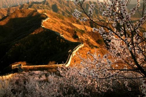 北京慕田峪長城掩映在綻放的杏花中。新華社發(fā)(卜向東 攝)