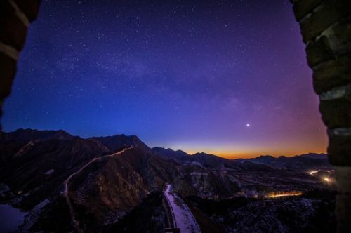 這是在北京懷柔黃花城長城一座烽火臺(tái)上拍攝的日出前的星空。新華社記者楊光 攝
